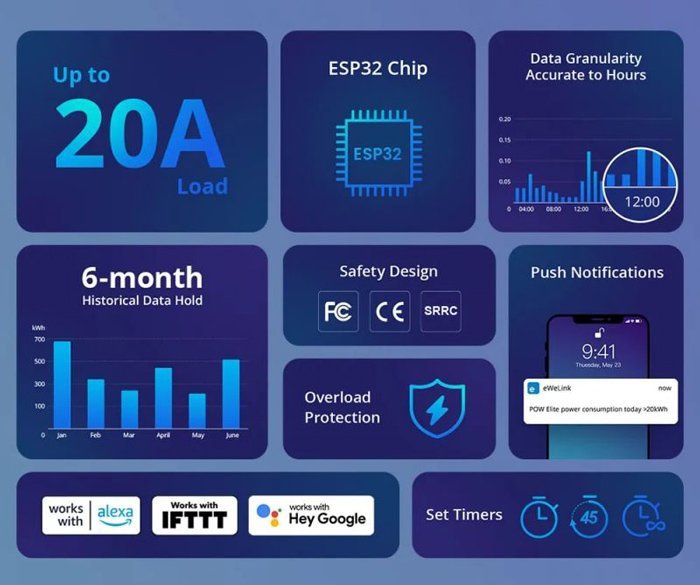 Λειτουργεί σαν συσκευή παρακολούθησης ισχύος, η οποία σας επιτρέπει να παρακολουθείτε την ακριβή τάση και ισχύ σε πραγματικό χρόνο μέσω της εφαρμογή eWeLink για smartphone. Ορίζοντας τιμές κατώτατου ορίου για το ρεύμα, την τάση και την ισχύ, ο διακόπτης μπορεί να προστατεύσει τις συσκευές σας από υπερφόρτωση.