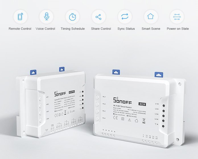 Το Sonoff 4CH R3 είναι ένας ασύρματος WiFi διακόπτης 4 καναλιών ο οποίος μπορεί να ελέγξει τέσσερεις οικιακές ηλεκτρικές συσκευές. Αυτό σημαίνει οτι ενσωματώνει τέσσερις Sonoff Basic διακόπτες! Διαθέτει όλα τα πλεονεκτήματα του Sonoff Basic διακόπτη όπως εύκολη εγκατάσταση και χειρισμός, γρήγορη πρόσβαση WiFi, απομακρυσμένη διαχείριση μέσω εφαρμογής. Οι χρήστες μπορούν να ενεργοποιήσουν/απενεργοποιήσουν από απόσταση τα συνδεδεμένα φώτα/συσκευές από το iOS/Android με την εφαρμογή eWeLink. Μπορούν να δημιουργήσουν ενεργοποιημένους χρονοδιακόπτες μονής/επανάληψης/αντίστροφης μέτρησης για αυτόματη ενεργοποίηση/απενεργοποίηση κατά την καθορισμένη ώρα. Οι χρονομετρητές λειτουργούν ακόμα και όταν το δίκτυο δεν είναι διαθέσιμο. Για να μπορούν οι συσκευές να ελέγχονται από άλλους, οι χρήστες μπορούν απλώς να μοιράσουν τις συσκευές σε άλλους λογαριασμούς και να ενεργοποιήσουν το συγκεκριμένο χρονοδιακόπτη.
