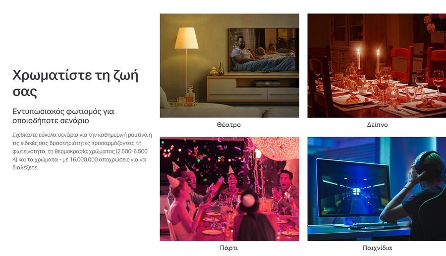 -Πολύχρωμη – Σχεδιάστε εύκολα σενάρια για την καθημερινή ρουτίνα ή τις δραστηριότητές σας προσαρμόζοντας τη φωτεινότητα, τη θερμοκρασία φωτός και τα χρώματα – με 16.000.000 αποχρώσεις για να διαλέξετε.