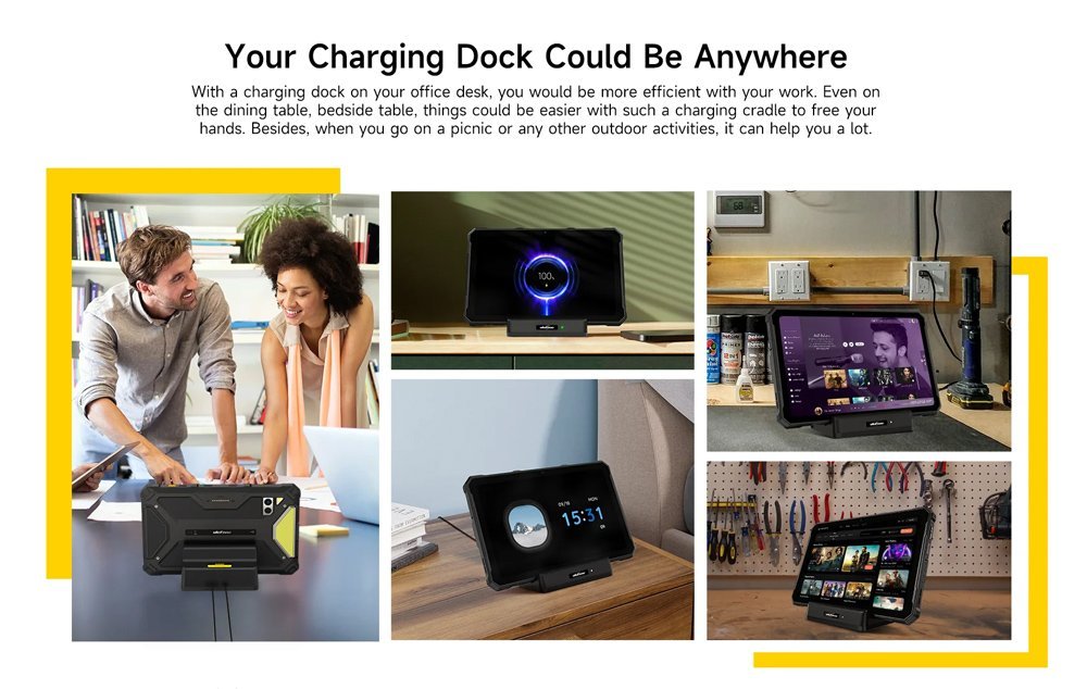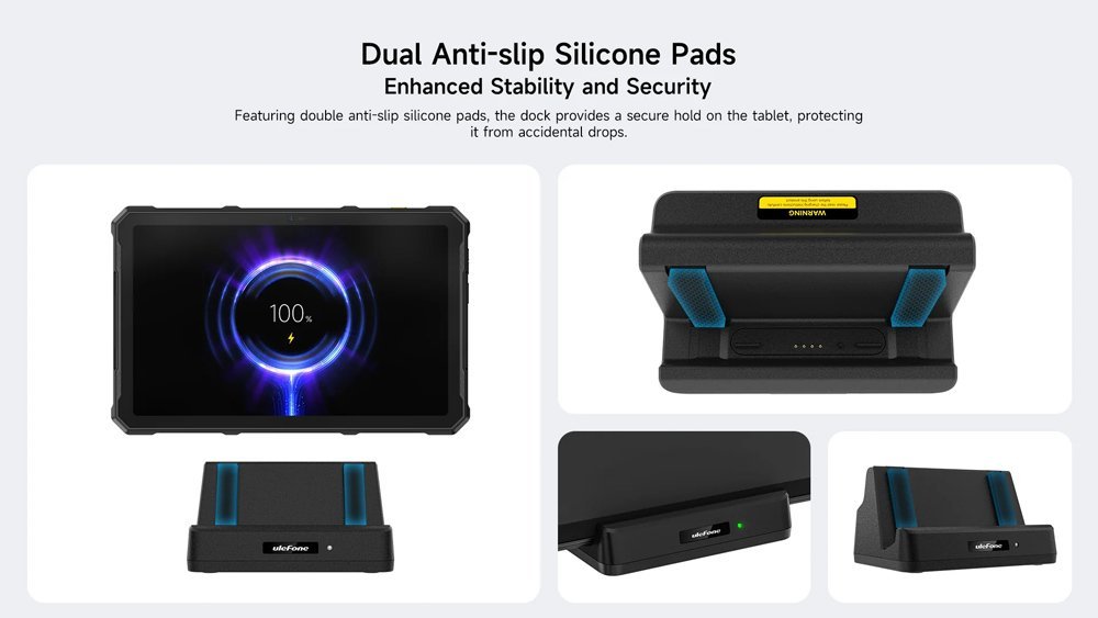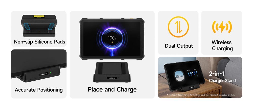 Επιτραπέζια βάση φόρτισης από την Ulefone, συμβατή με τα tablet της σειράς Armor Pad 4. Φορτίζει την συσκευή σας μέσω των επαφών Pogo Pin με μέγιστη απόδοση 10W. Επιπλέον, στο πίσω μέρος της διαθέτει έξοδο USB που σας επιτρέπει να φορτίζετε παράλληλα ακόμη μια συσκευή η όποια φορτίζει μέσω θύρας USB.