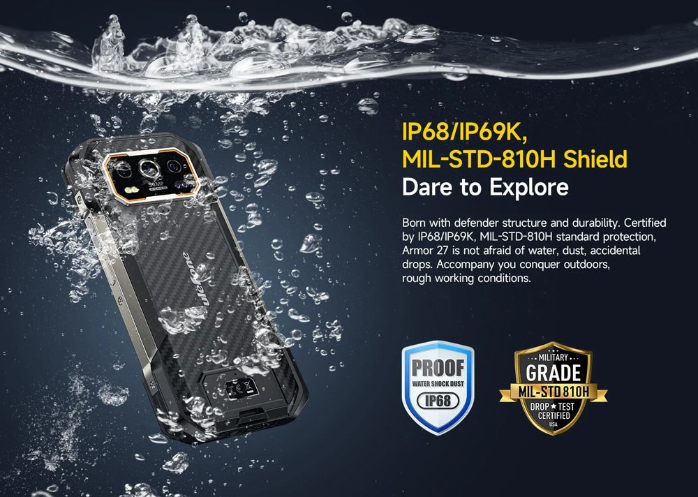 Με πιστοποίηση IP68/IP69K και πρότυπο MIL-STD-810H, το Armor 27 είναι σχεδιασμένο για να αντέχει σε ακραίες συνθήκες χρήσης και περιβάλλοντα.