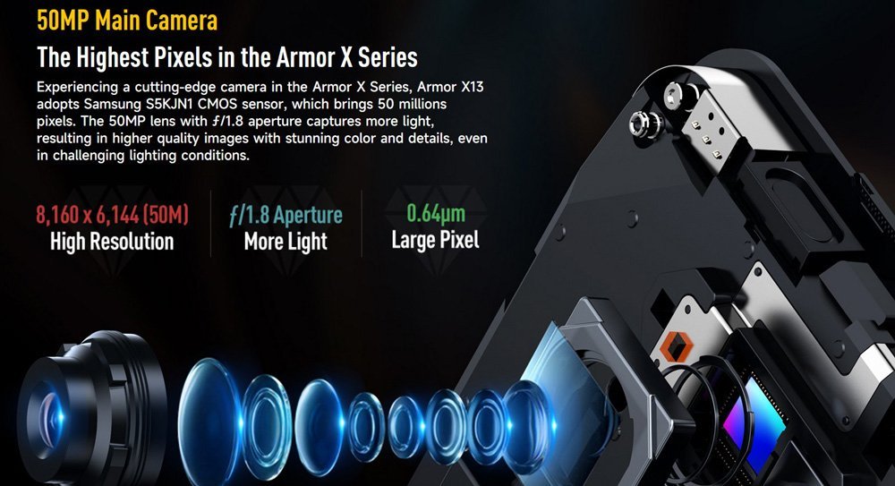 Με κύρια κάμερα 50MP, με αισθητήρα Samsung και εμπρόσθια κάμερα 8MP, μπορείτε να τραβήξετε εικόνες υψηλής ανάλυσης, με εξαιρετική σαφήνεια και ζωντανά φυσικά χρώματα. Επιπλέον χάρη στην αδιάβροχη προστασία του υποστηρίζει υποβρύχια λήψη φωτογραφιών και βίντεο.