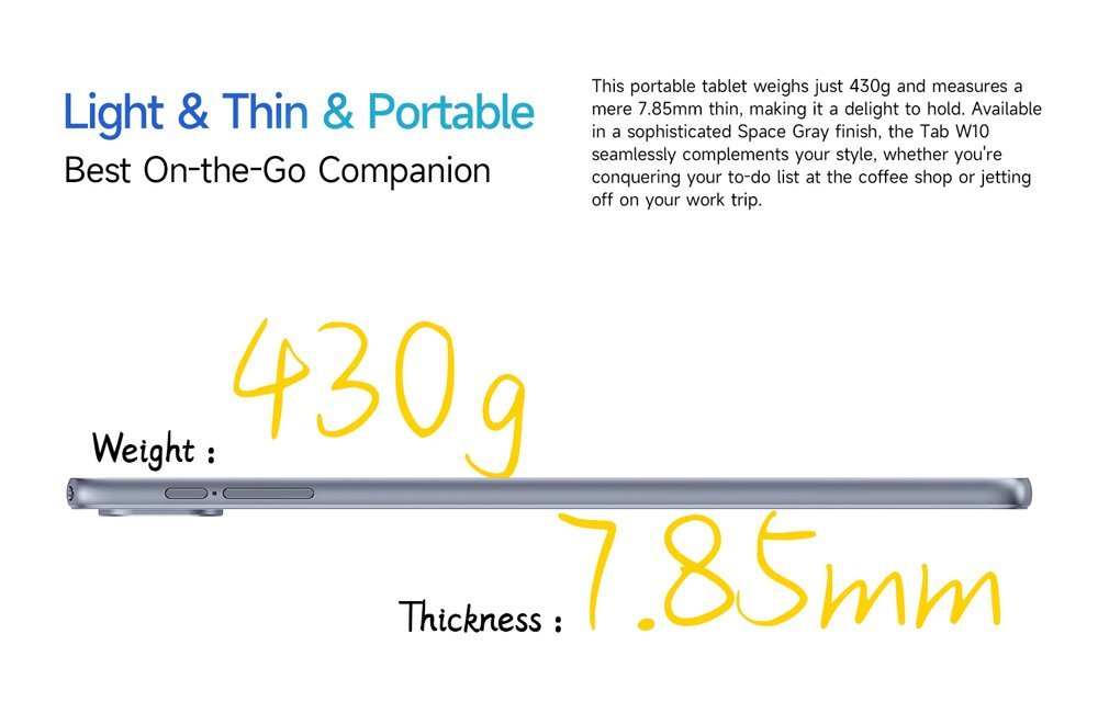 Με ένα ελαφρύ και λεπτό μεταλλικό σώμα, το Tab W10 είναι άνετο στη χρήση και εύκολο να μεταφέρεται παντού.