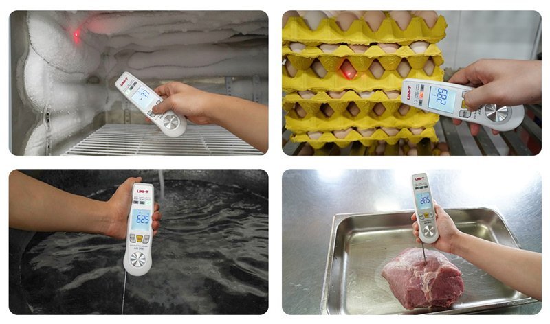 Το A63 είναι ένα θερμόμετρο τροφίμων με αισθητήρα υπερύθρων και πτυσσόμενο αισθητήρα. Παρέχει μια ιδανική λύση μέτρησης και παρακολούθησης της θερμοκρασίας για επαγγελματίες στη βιομηχανία τροφίμων. Ο αισθητήρας υπερύθρων μπορεί να σαρώσει γρήγορα τη θερμοκρασία επιφάνειας των τροφίμων ενώ ο πτυσσόμενο αισθητήρας μπορεί να χρησιμοποιηθεί για την μέτρηση της θερμοκρασίας στο εσωτερικό του τροφίμου. Διαθέτει δείκτη φωτός για το εύρος θερμοκρασίας, λειτουργία που το καθιστά ιδανικό HACCP (Hazard Analysis and Critical Control Point) επιθεώρηση, για τη διασφάλιση της ασφάλειας των τροφίμων. Είναι κατάλληλο για βιομηχανίες επεξεργασία, μεταφοράς και αποθήκευσης τροφίμων, για καταστήματα εστίασης κ.α.