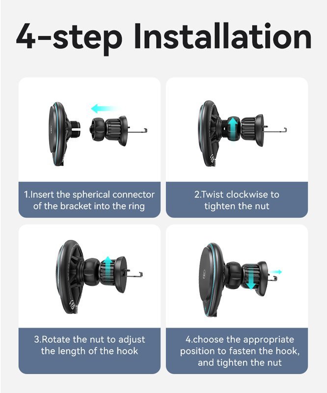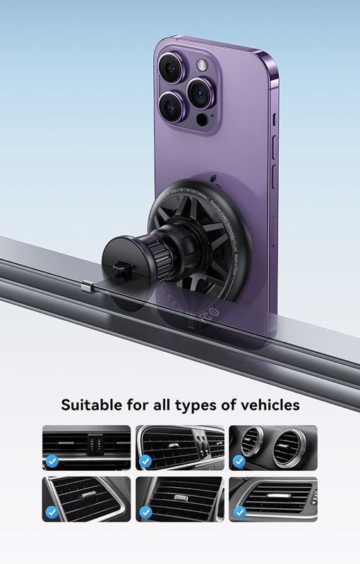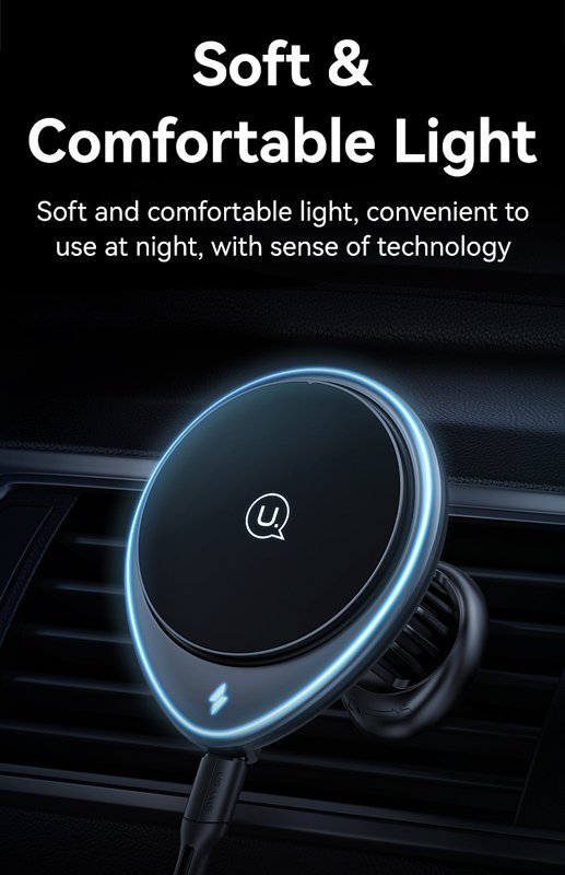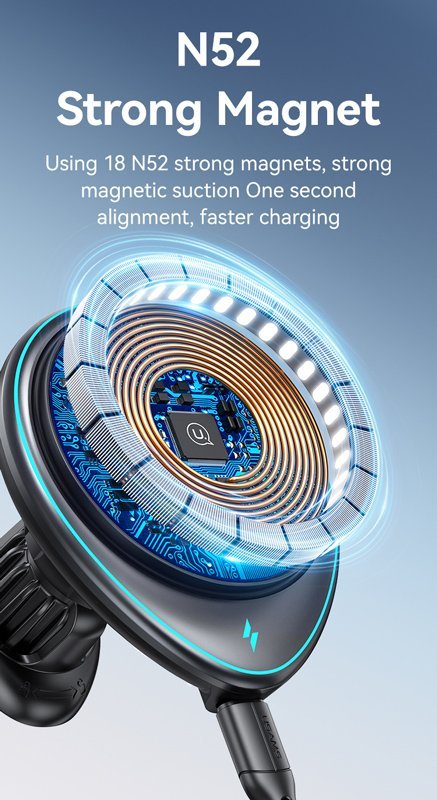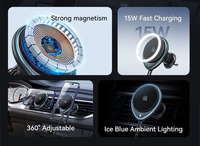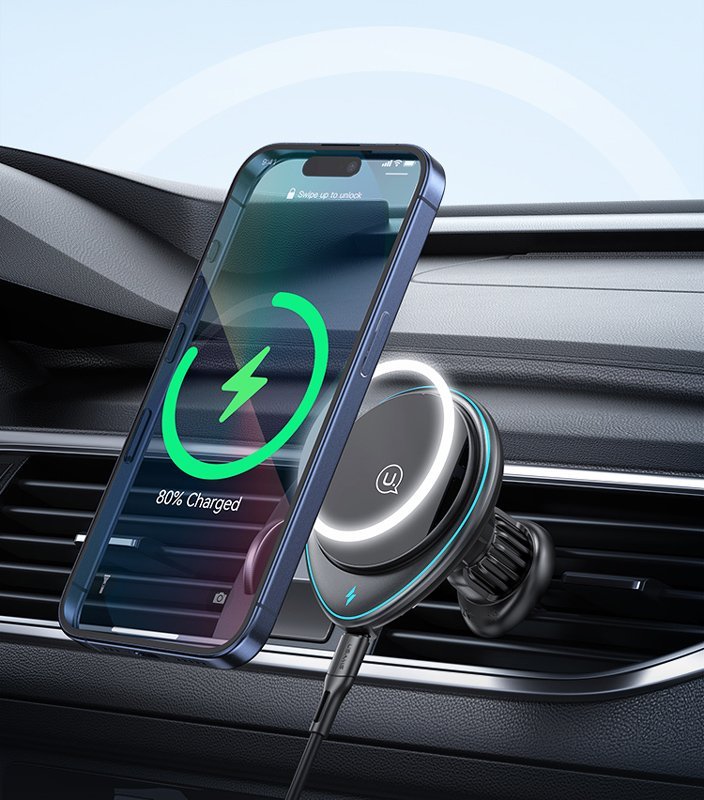 Ασύρματος φορτιστής και βάση αυτοκινήτου με στήριξη σε οριζόντιους ή κάθετους αεραγωγούς του αυτοκινήτου. Συγκρατεί το smartphone σταθερό και ασφαλές με ισχυρή μαγνητική δύναμη ενώ παράλληλα το φορτίζει ασύρματα με απόδοση έως 15W.