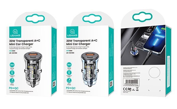 USAMS φορτιστής αυτοκινήτου US-CC164, USB & USB-C, 30W, μαύρος