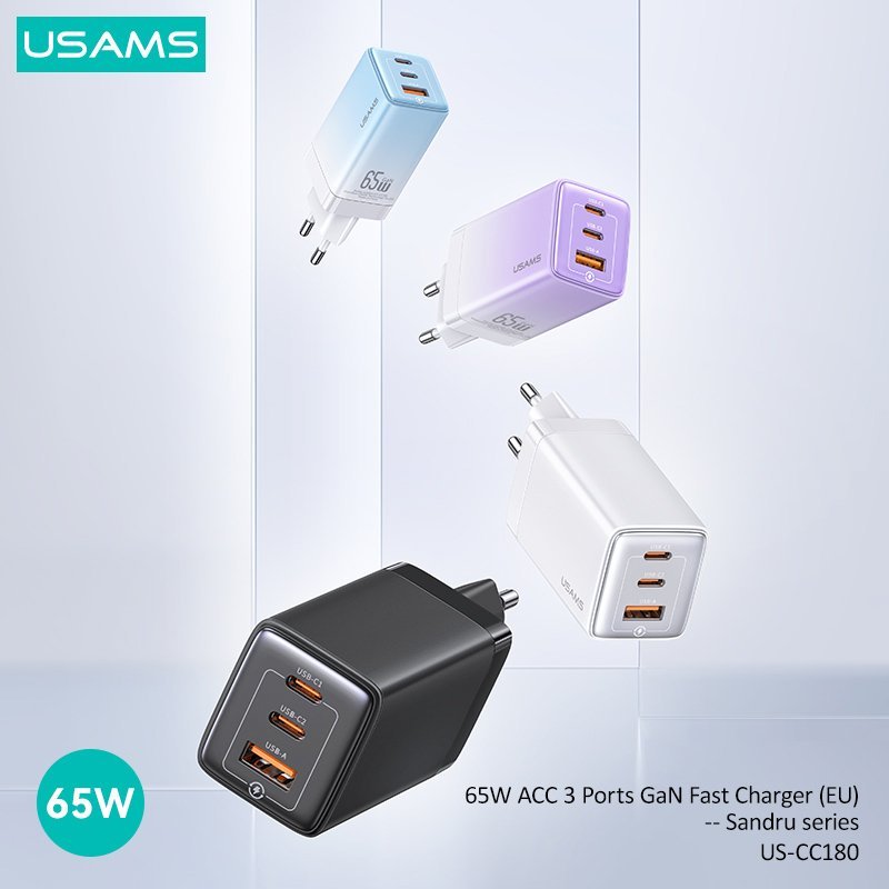 USAMS φορτιστής τοίχου US-CC180, USB & 2x USB-C, 65W PD, GaN, μαύρος