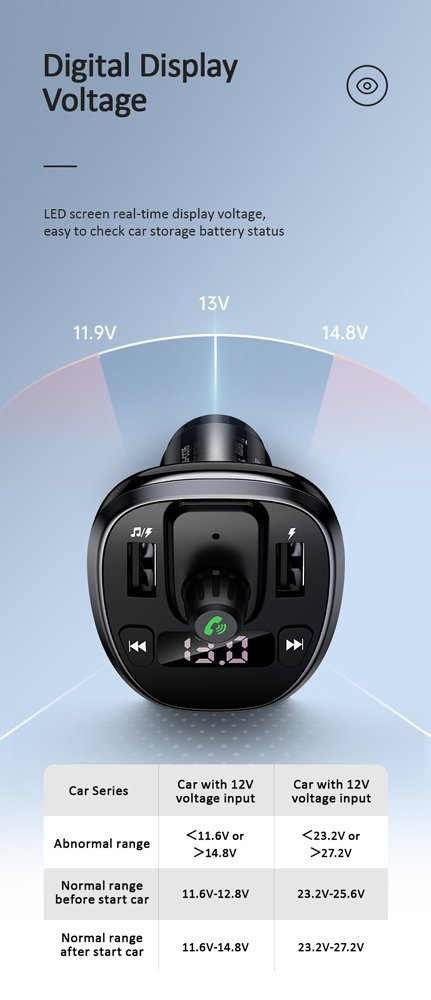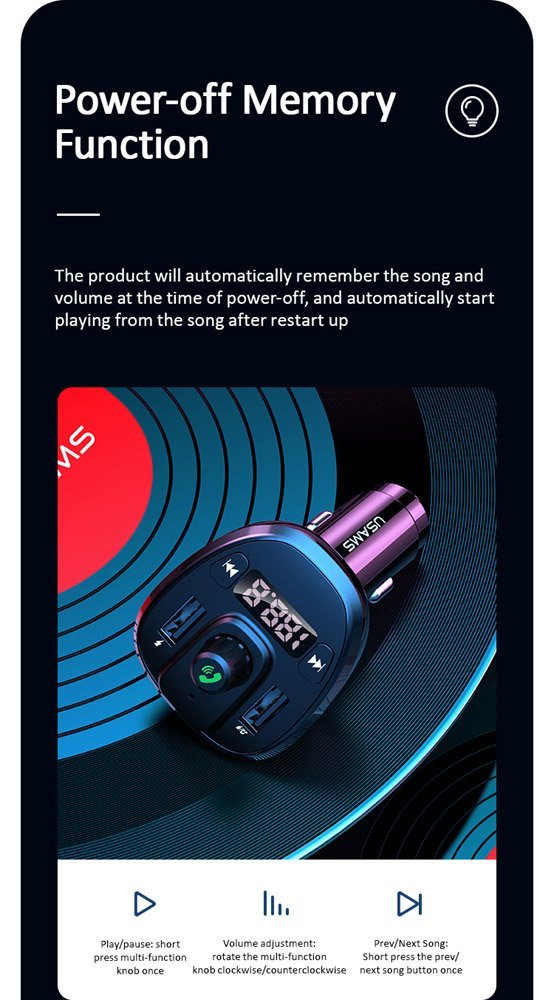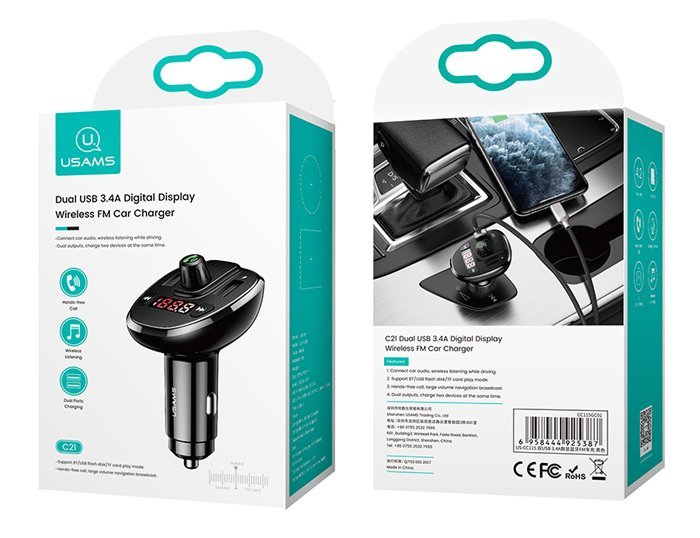 Ο FM Transmitter της Usams επιτρέπει την ασύρματη μετάδοση ήχου από την συσκευή προς το ραδιόφωνο του αυτοκινήτου σας. Είναι ιδανικός για αυτοκίνητα που δεν έχουν players με δυνατότητα αναπαραγωγής MP3 αρχείων. Υποστηρίζει αναπαρωγή μέσω bluetooth, SD κάρτας ή USB flash disk (έως 64GB). Διαθέτει ευανάγνωστη οθόνη η οποία απεικονίζει χρήσιμες πληροφορίες και extra USB θύρα για φόρτιση συσκευών, απόδοσης έως 3.4A. Υποστηρίζει λειτουργία κλήσης, με το πάτημα ενός κουμπιού.