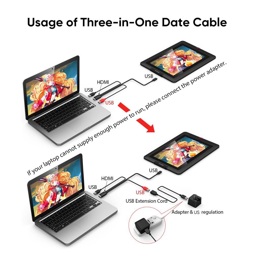 Καλώδιο 3 σε 1 από HDMI σε USB-C και 2x USB, κατάλληλο για την σύνδεση ταμπλετών σχεδίασης της XP-PEN με desktop ή laptop.