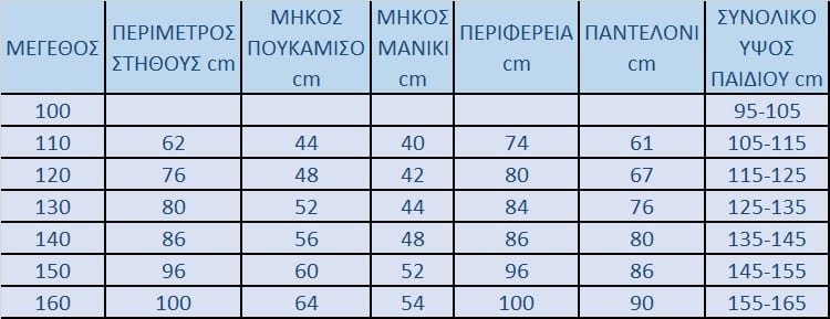 ΠΡΟΣΟΧΗ: Μετρήστε το παιδί από τον ώμο μέχρι κάτω και την περίμετρο στήθους και βρείτε το κατάλληλο μέγεθος από την παρακάτω ταμπέλα. Οι διαστάσεις στη παρακάτω ταμπέλα είναι οι πραγματικές διαστάσεις του ρούχου. Μετρώντας π.χ. το παιδί από τον ώμο μέχρι κάτω βλέπετε στη ταμπέλα ποιο μέγεθος ταιριάζει καλύτερα, δηλαδή πού θα φτάσει το ρούχο.